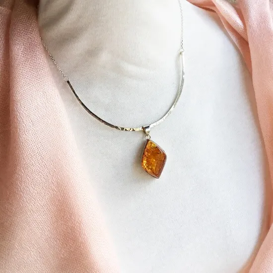 菱形に見えるファンシーカットのアンバーに、打延べした銀線のチョーカーを合わせたハンドメイドのペンダントです。