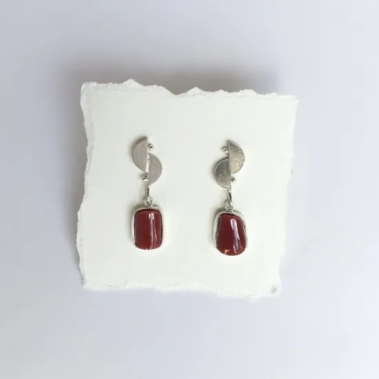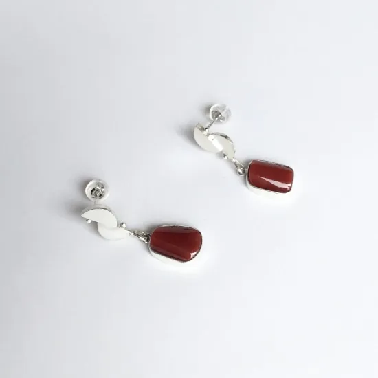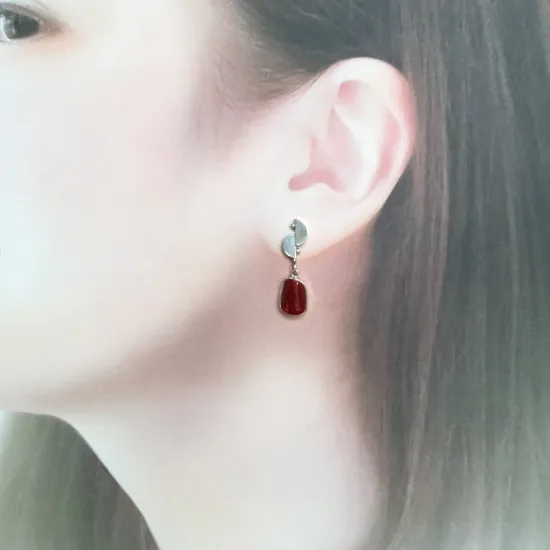 珊瑚の枝の形をそのまま生かしてカットされた深い赤、、Japanese Redのコーラルをシルバーピアスにしました。