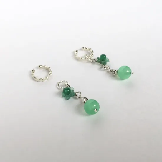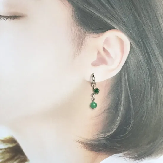 花の形に彫刻されたグリーンアゲートと丸玉のクリソプレーズを組み合わせたチャームが印象深いハンドメイドの銀製のイヤリングです。