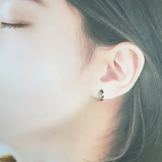 Cタイプのイヤリングは耳の薄い部分から入れ耳たぶの厚いところで安定させることができます。