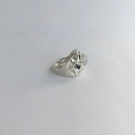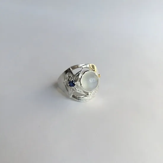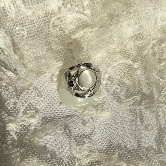 澄んだキャッツアイ効果のムーンストーンと青い星のようなブルーサファイアを、それぞれ月と星のモチーフに合わせたハンドメイドのリングです。