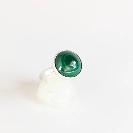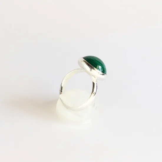 縞模様を見事に生かしてカボションカットされたマラカイトを、まろやかな覆輪で止めたハンドメイドのリングです。