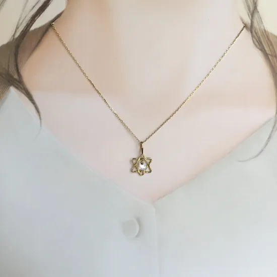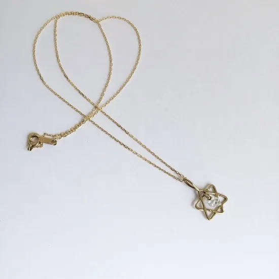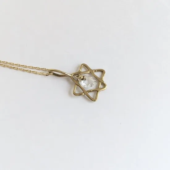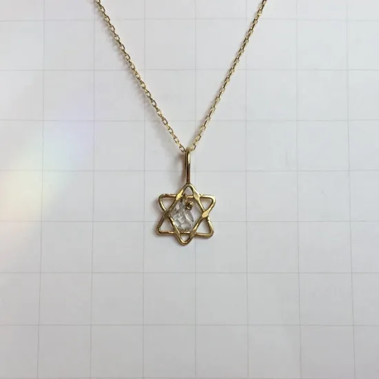 小さいけれど澄み切ったハーキマーダイヤモンドを18金の六芒星の真ん中に提げたハンドメイドのペンダントです。