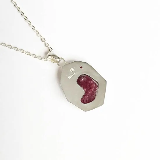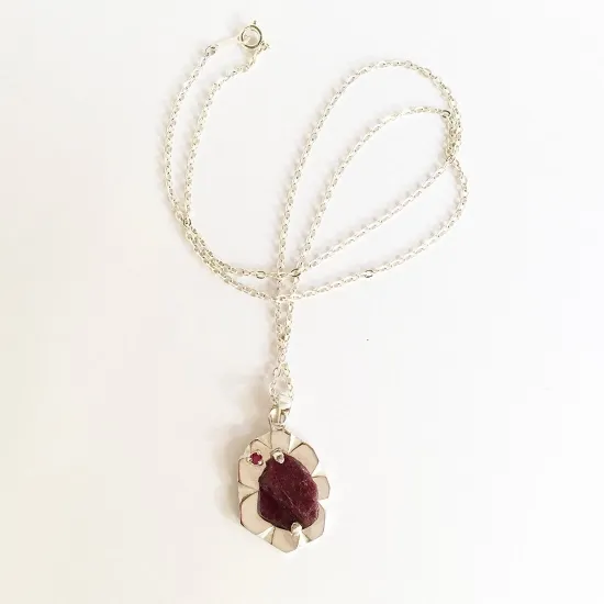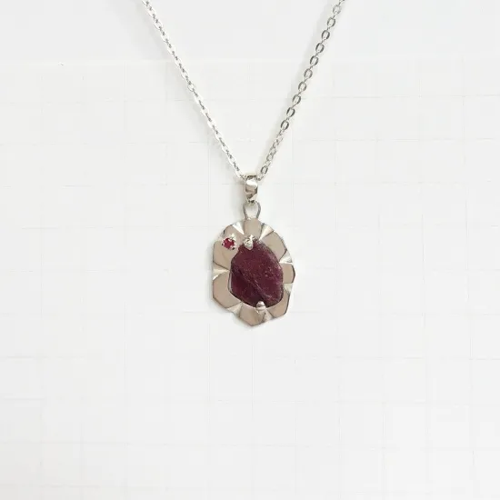 原石を割っただけの力強いルビー1.67gと人の手で磨かれた愛らしいルビー0.1ctに950銀を合わせたハンドメイドのペンダントです。
