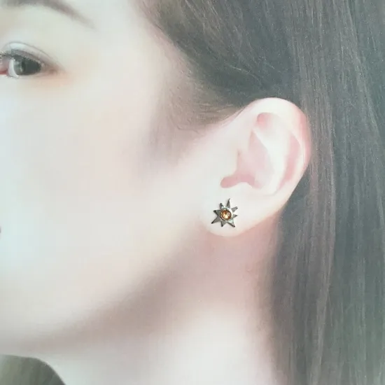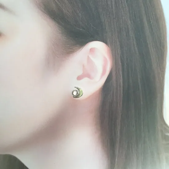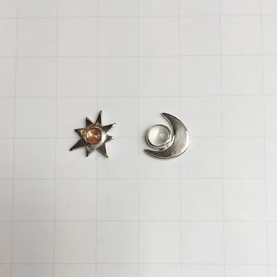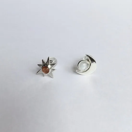 太陽と月をイメージしたハンドメイドの銀のピアスです。サンストーンからは強い光が、ムーンストーンからはハッキリとしたキャツアイ効果が見えます。サンストーンの直径は4mm程、ムーンストーンの直径は5.5mm程です。