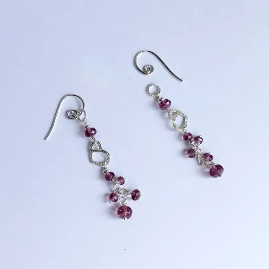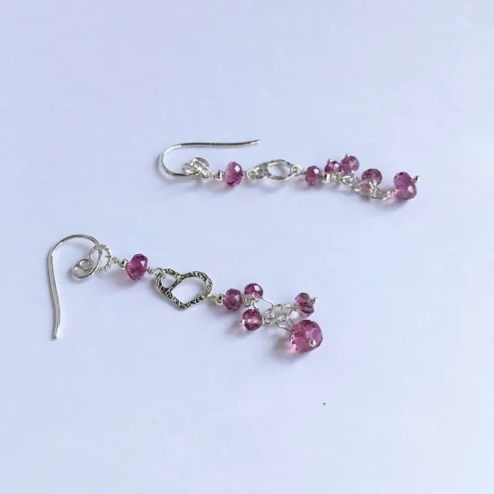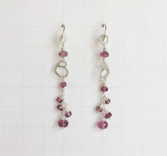 ピンクトルマリンのカットビーズとオリジナルの打刻入りのパーツを合わせたハンドメイドの銀のピアスです。